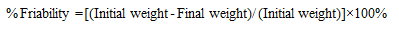 Friability testing is carried out to check how much mechanical stress can be tolerated by the tablets during its manufacturing, distribution, and handling. The instrument used to determine the friability is called Friabilator or friability tester. 10 tablets were weighed and placed in the friability test apparatus EF2-USP. The apparatus was operated for 4 min ie., 100 rotations (25 rpm) and the tablets remained intact were weighed and recorded [22]. For calculating % friability, the equation given below was used. Friability less than 1% is considered as acceptable [23-26].