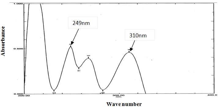 Standard plot of ondansetron hydrochloride is shown in fig. 3. The linearity was observed in the range of 4-24 μg/ml with a correlation coefficient of 0.999. The maximum absorbance of ondansetron hydrochloride was detected at 249 nm and depicted in fig. 4. It is observed that 310 nm can also be selected as λmax since there was no much difference found in the absorbance value. There are more literatures available with 310 nm; hence it is selected for this study [31-35].