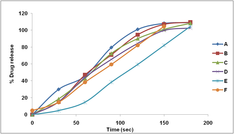 Dissolution profiles of the tablets are shown in fig. 9. Code A tablets had shown a faster release of 100.93% at 120 sec. When compared to all other codes of tablets, Code F tablets released slowly but within the limits (3 min) as specified in IP [3]. Hence all the codes of tablets are within the official prescribed limits.