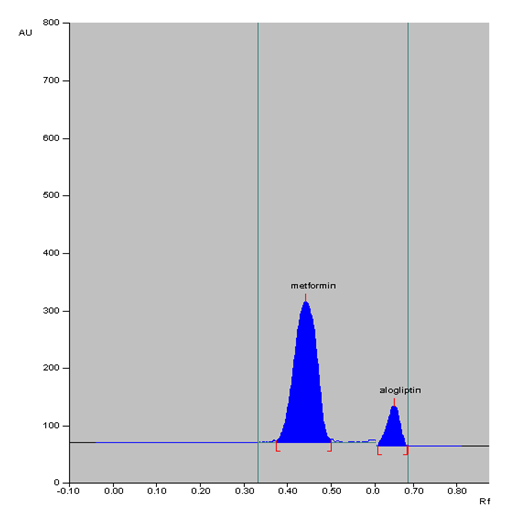 The chromatograms of the drugs are extracted from commercial formulation, exhibited two peaks at Rf value of 0.44 and 0.66 for metformin and alogliptin, respectively. The results of the analysis of the marketed formulation are given in table 2.