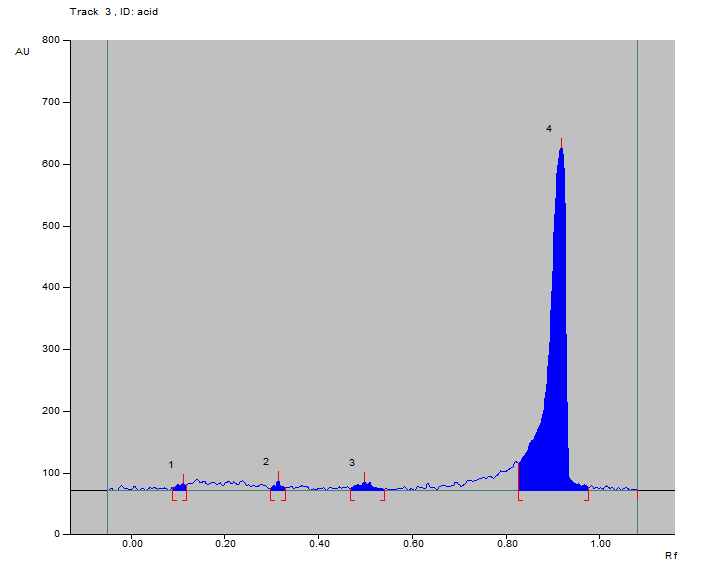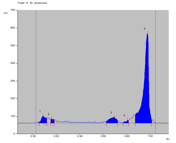 The 40 mg of metformin and 1 mg of alogliptin was transferred into a clean and dry Petridis. The Petridis was placed in direct sunlight for 5 d. In this study, the drug substance was exposed to direct sunlight for 5 d to determine the effect of irradiation on the stability of the drugs in solid-state. Afterward, the drug was transferred into a 10 ml volumetric flask and make up the volume with the mobile phase.1 ml of the above solution was transferred into a 10 ml volumetric flask and diluted with 10 ml using the mobile phase. The resultant solution was applied to the TLC plate in triplicate [17].