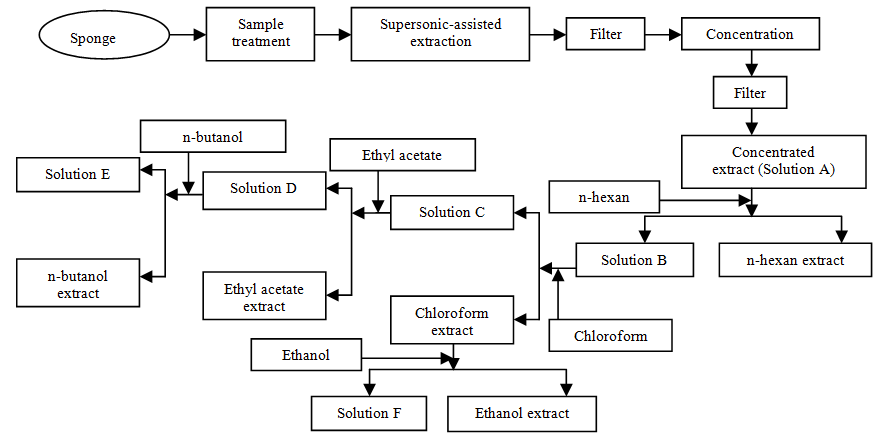 Cleaning the sponge sample A. suberitoides was by seawater after sampling and transported to the laboratory under the condition at 10 °C. In the laboratory, storing the sponge was in-80 °C. When liquid nitrogen fully degraded the sponge cells, bringing the mixture assimilated at 5.000 rpm, then stored at-80 °C. Collecting the initial extract was by supersonic-assisted maceration method and methanol solvent. Segmenting concentrated methanol extract was by liquid-liquid extraction in the following solvent order: n-hexane, chloroform, ethanol, ethyl acetate, n-butanol, respectively (fig. 2). All extract fractions were filtered through Whatman filter paper no. 4, and then concentrated at 40 °C. After concentration, all residues dissolve were into 20 ml of 96 % ethanol, and the storage of them at 4 °C.
