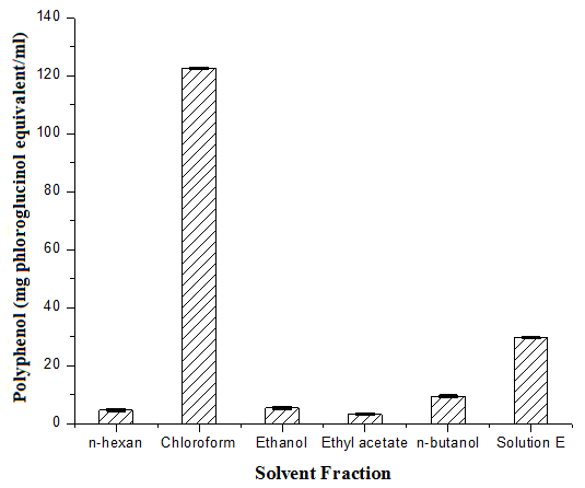 Polyphenol content corresponded to 2.63%, 1.81%, 5.35%, 6.94%, and 3.01% for the extract of n-hexane, ethyl acetate, n-butanol, solution E, and ethanol, respectively, compared to the polyphenol content of the initially concentrated extract. Non-polar polyphenol content was 3.03 times total polyphenol content of polar aprotic and polar protic. The total volume of ethyl acetate, n-butanol, and chloroform were three, three and eight times that of solution C, solution D and initially concentrated extract, respectively. Ethyl acetate extract had the lowest polyphenol content, compared to other extracts.