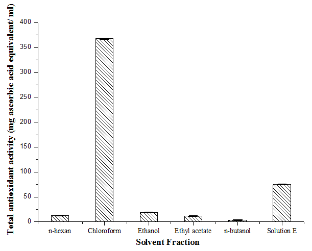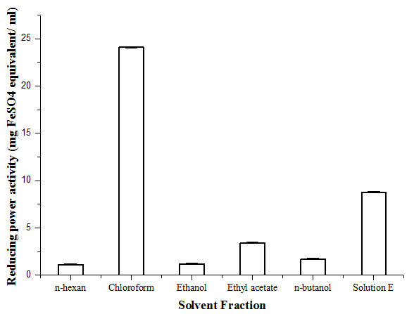 The difference in reducing power activity was significant in different extracts (p<0.05). Chloroform extract exhibited the highest reducing power activity, compared to another extract. Reducing power activity of different extracts was decreased in order to chloroform/solution E/ethyl acetate/n-butanol/ethanol/n-hexane, corresponded to 24.08 mg FeSO4 equivalent ml-1, 8.79 mg FeSO4 equivalent ml-1, 3.41 mg FeSO4 equivalent ml-1, 1.71 mg FeSO4 equivalent ml-1, 1.20 mg FeSO4 equivalent ml-1, 1.12 mg FeSO4 equivalent ml-1, respectively (fig. 6). Reducing power activity of chloroform extract was 21.56 times stronger than that of n-hexane extract. Reducing power activity of n-hexane extract was 0.597 times that of all extracts, 0.89 times that of an initial concentrated extract. Strongly interaction between polyphenol content and reducing power activity has happened (y = 0.189x+1.213, R2 = 0.974).
