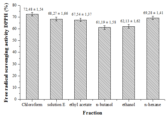 The solvent effect on radical scavenging activity was similar to that on the polyphenol content and the activity of total antioxidant and reducing power. DPPH radical scavenging activity decreased as follow: chloroform, n-hexane, solution E, ethyl acetate, ethanol and n-butanol, correspond to 72.48±1.54 %, 69.28±1.41 %, 68.27±1.66 %, 67.54±1.37 %, 62.13±1.62 %, 61.19±1.58 %, respectively (fig. 7). The difference of radical scavenging activity revealed significant for various extracts (p<0.05).