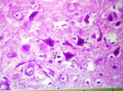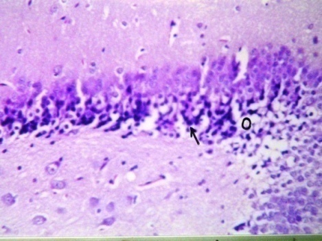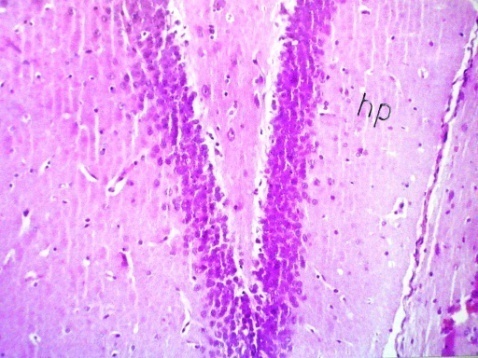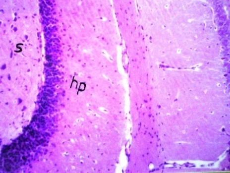 After twenty four hours of brain tissue fixation, washing was done in tap water then serial dilutions of alcohol (methyl, ethyl and absolute ethyl) were used for dehydration. Specimens were cleared in xylene and embedded in paraffin at 56 degrees in hot air oven for twenty four hours. Paraffin bees wax tissue blocks were prepared for sectioning at 4 μ thick by slidge microtome. The obtained tissue sections were collected on glass slides, deparaffinized and stained by hematoxylin and eosin (H&E) stain [29] for the histopathological examination through the light microscope Nikon,Japan,with objectives 5x.