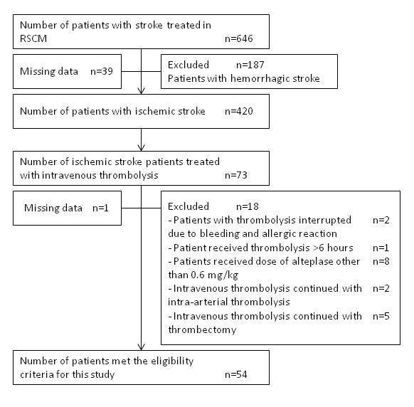 There were 646 stroke patients treated in Cipto Mangunkusumo General Hospital between November 2014 and August 2017. Most stroke was ischemic stroke (65%; n=420). 73 ischemic stroke patients (17.4%) received thrombolytic therapy. Thrombolytic therapy on two patients was stopped due to hematemesis and allergic reaction. One patient received thrombolytic therapy more than 6 h of stroke onset. Eight patients were given a dose of alteplase other than 0.6 mg/kg. Intravenous thrombolysis on two patients was continued with intra-arterial thrombolysis and on five patients was continued with thrombectomy. In total, there were 54 patients met the inclusion criteria of this study (fig. 1).