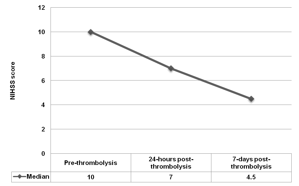 Fig. 3: Line chart showing a decrease of NIHSS median from pre-thrombolysis to 24 h and 7 d post-thrombolysis
