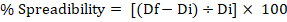 Applicability parameters of oleogels include determination of extrudability and spreadability. Extrusion of oleogel was studied by measuring the distance travelled by the ribbon of gel extruded from a collapsible tube in 10 s. Approximately 1 g of the oleogel was placed between two glass slides of equal weight, area and thickness. Initial spreading diameter (Di) was noted. Thereafter, a load of a known weight of 10, 20, 50, or 100 g was applied individually on the upper slide for 1 min and the final spreading diameter (Df) of the gel was noted in each case. Extrudibilityand spreadability are expressed in cm/s and percentage respectively. The % spreadability was calculated as per the equation is given below [5].