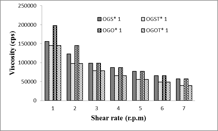Rheological study was performed by determining the viscosities of OGS* 1, OGST* 1, OGO* 1 and OGOT* 1 in Brookfield digital viscometer (Model LVDVI+) at 25°C. The study was done by applying a shear rate of 1-5 r. p. m (spindle 6) for 1 min. Ostwald de-wale power model (equation 4) was employed to establish a relationship between shear rate (ɤ), shear stress (Ʈ), flow behavior index (n) and flow consistency index (k) [3].