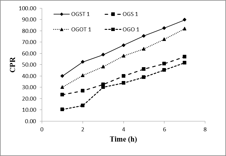Highest drug release was obtained from oleogels of soybean oil and olive oil containing Tween as cogelator. However, paracetamol release was lower from olive oil-based gel. The CPR profiles of the gels are represented in fig. 3. The kinetic model and mechanism of diffusion followed by oleogels are summarized in table 4.