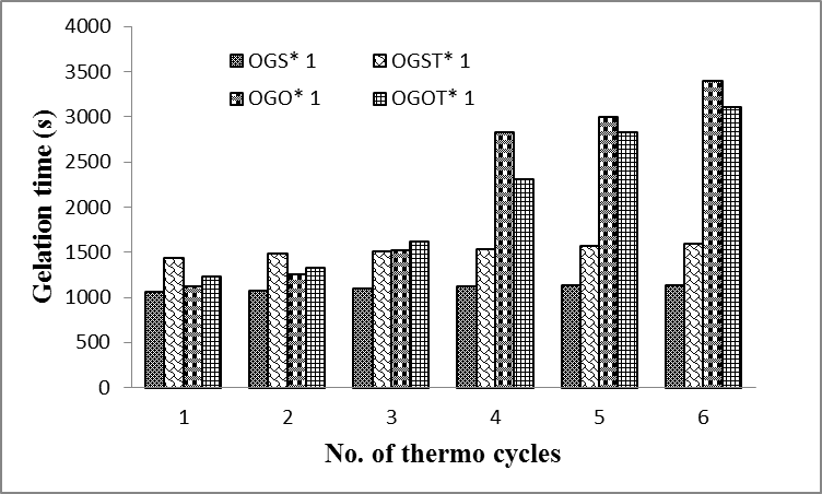 Soybean and olive oil-based oleogels at their CGC were found to be stable up to 6 thermo-cycles which are represented graphically (fig. 4).