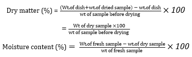 Methods: Finely grounded samples of selected plants were subjected to chemical analysis by AOAC (1995). The total nitrogen content was determined following the standard Kjeldahl’s method using Kel Plus Semi Automatic Nitrogen Analyzer (Pelican Equipments). Determination of ether extract (EE) was done with the help of Soxhlet’s apparatus. For determination of dry matter (DM), crude fiber (CF), nitrogen detergent fibre (NDF), acid detergent fiber (ADF) and total ash (TA), standard conventional procedures were followed. The conventional Weende’s method was followed for the calculation of nitrogen free extract (NFE). The method of Talapatra et al. (1940) was followed for the determination of calcium and phosphorus.
