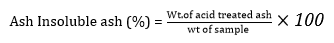 The residue left after boiling after total ash with 50% HCl is called acid insoluble ash and it is largely silica. The ash is digested with dilute HCl to dissolve inorganic salts.