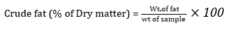 Ether was continuously volatilized, then condensed and allowed to pass through the sample, extracting ether soluble materials. The extract was collected in a flask. When the process was completed, the ether was distilled and collected in another container and the remaining crude fat was dried and weighed.