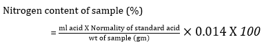 Accurately 1 gm of sample was weighed and put in a digestion flask. 10 gm potassium sulphate, 0.7 gm mercuric oxide and 20 ml sulphuric acid were added. The flask was heated gently at an inclined angle until frothing subsides and then boiled until the solution clears. Boiling went on for an additional half hour. On cooling, about 90 ml. Distilled water was added, re cooling was done, 25 ml. Sulphide solution was added and mixed. Small pieces of boiling chip added at prevent bumping and 80 ml. of sodium hydroxide solution while tilting the flask so that two layers were formed. The condenser unit was connected rapidly, heated, and collected distilled ammonia in 50 ml. Boric acid/indicator solution. 50 ml of distillate was collected. On completion of distillation; the receiver was removed and titrated against standard acid solution.