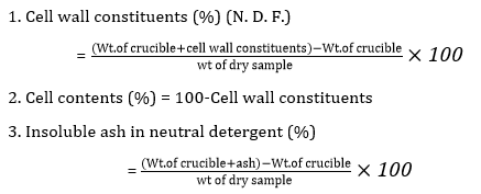 1 gm of air dried meshed sample was taken. 100 ml preheated neutral detergent solution, 2 ml of decalin and 0.5 gm sodium sulphite were added in order and refluxed for 60 min. regent was filtered off, washed thrice with hot distilled water under vacuum, vacuum removed, the mat was broken up and crucible was washed with hot water. Washing was given twice with acetone and suck dry. Crucible was dried at 100˚C for 8 hours and weighted. Yield of recovered N. D. F. was reported as the cell wall constituent.
