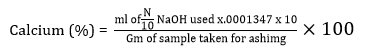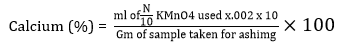 From the stock solution of acid soluble ash, 25 ml. of aliquot was taken in 250 ml. beaker. 50 ml. of distilled water, 10 ml. of freshly prepared saturated Ammonium oxalate solution and 10 ml of concentrate hydrochloric acid was added. 2 drops of alcoholic methyl red indicator were added. Acidity was adjusted to pH 4.6 by adding drop by drop concentrated ammonium solution till an orange brown color precipitate begins to appear. Dilute ammonium solution (1:4) was added drop by drop till a white color precipitate appears. Content of beaker was kept overnight to allow the precipitate to settle down and the supernatant was filtered through Whatman filter paper No. 42. The precipitate was washed with hot distilled water several times to eliminate an excess of oxalates. The filter paper was then transferred to the same beaker and 100 ml of hot distilled water was added. It was dissolved in 10 ml of conc. H2SO4 and was heated at 60-70°C then titrated against N/10 KMnO4 until stable pink color appeared.