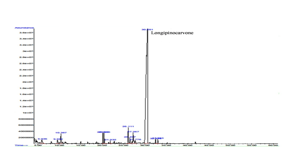 Further, (R)-(–)-Carvone has been proposed for use as a mosquito repellent and the U. S. An Environmental Protection Agency is reviewing a request to register it as a pesticide. The percentage of this compound is very low in other plants studied so far like 5.68% in Litsea fulva [9], 0.35 in Bidens parviflora [10] etc. which are quite difficult to exploit commercially. As per the result Boesenbergia longiflora the only plant which occupies 81.69% of area as longipinocarvone having enough significance for commercial exploitation. The present work will give a strong support to carry out further research on it. This report could help to isolate the compound from this plant and to carry out its bioactivity studies for exploring the full potential of Boesenbergia longiflora.