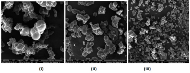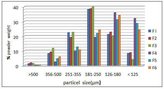 The result of observation of shape and morphology of powder blend by means of Scanning Electron Microscope (SEM) as showed in fig. 1. The powder blend results co-processed via spray dried had a spherical shape and refine of surface texture. From fig. 1 with magnification of 1000 times is seen that through the co-processed and spray dry excipient (fig. 1, i and ii) has a larger particle size and spherical shape, spherical shape of the particles and the size of the larger particles produce a powder blend that has a better flow rate [29]. Powder blend particles (fig. 1, iii) have the form of a physical mixture are irregular shape (non spherical shape) according to the form of its original components, in addition to the particle size is smaller than the particle co-process the results. Particles size of powder blend as showed in fig. 2, particles size from co-process via spray dry have most in the range of 181-250μm so that the particles can be called with microspheres. When compared to physical mixture, powder the results of co-process via spray drying is to have larger grains, this is due to the incorporation of molecules MDS, PVP and Mnt into one larger molecules. Enlargement of particle-size is widely used to improve physical properties like wettability, flowability, bulk density and product appearance [9].