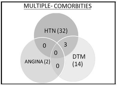 Fig. 1: Distribution of Co-morbidities in subjects of all 80 patients 32(40%) of patients were found to be Hypertensive 14(17.5%) were Diabetic and multiple risk factors were found in 3 patients with hypertension and diabetes.