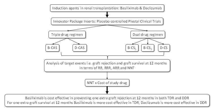 Methods: Two monoclonal antibodies (MAbs), used for induction therapy viz basiliximab and daclizumab in renal transplantation, were identified. Pivotal placebo controlled clinical trials, mentioned in the innovator package inserts, were compared and analyzed for acute graft rejection and graft survival at 12 mo. NNT viz-a-vis cost was calculated and compared.