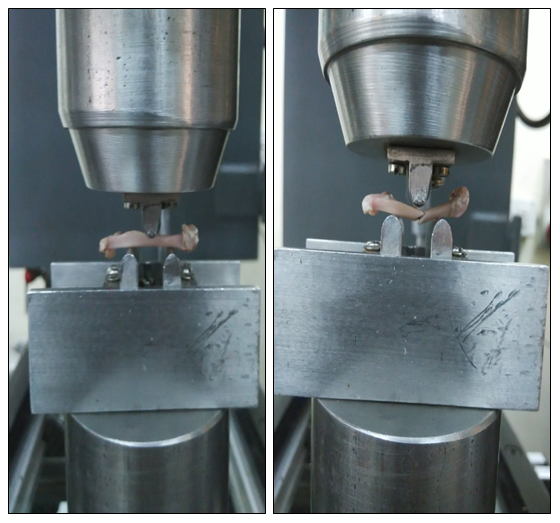 The biomechanical strength testing was performed on the compact bone using three-point bending test utilising 25 kN Universal testing machine (BiSS Makron, Bangalore, India). All the bone samples were thawed at room temperature before testing. For the test, the length of the bone samples was measured using vernier calliper. Tibia was placed horizontally on two supporting bars located at a span distance of 14 mm and third bar carefully positioned perpendicularly at the mid-axis of tibia bone (fig. 1). Load was applied at a displacement rate of 1 mm/sec until the bone fractures. The load-displacement curves were recorded (fig. 2) and calculated stiffness (N/mm), peak load (N), ultimate strength (mPa) and Young’s modulus (GPa) from the curve [28, 29]. All data were represented as mean±SD.