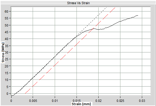 Fig. 2: Load (stress) displacement (strain) curve recorded from the three-point bending test.