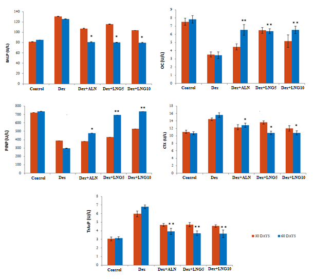 The levels of CTx, TrAcP and b-ALP were highly elevated after two months of treatment with dexamethasone indicating induction of osteoporosis, while the levels of OC and PINP were highly reduced (fig. 3). Significant changes were observed in the levels of BTMs after 60 d of treatment post osteoporosis induction. It was observed that b-ALP (p<0.05) levels reduced significantly and OC (p<0.05) and PINP (p<0.05) levels increased significantly when compared with the Dex group after treatment with both LNG5 and LNG10. Meanwhile, CTx (p<0.05) and TrAcP (p<0.05) levels were reduced significantly in the treated groups LNG5 and LNG10 when compared to Dex.
