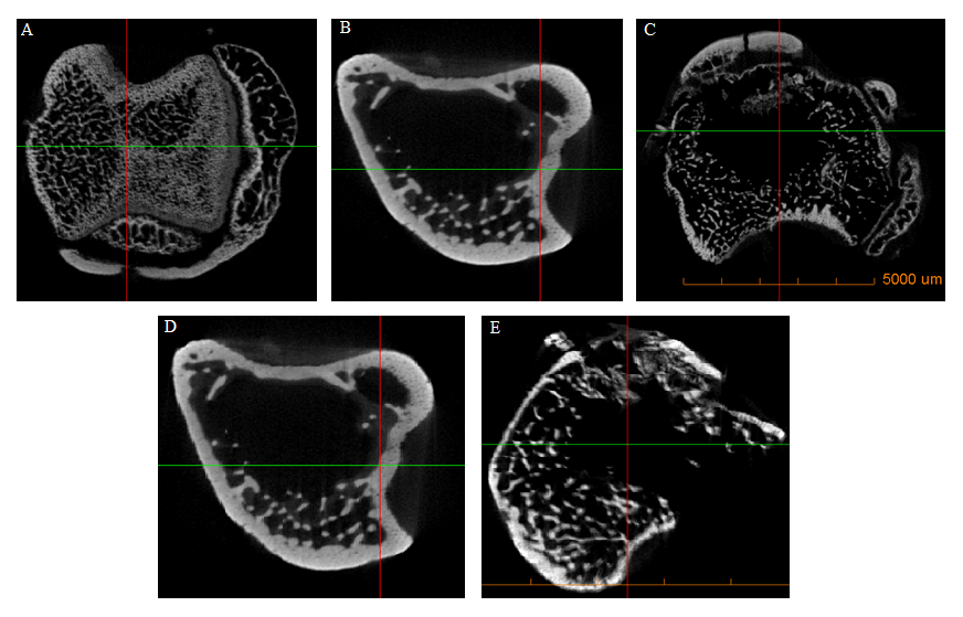 Fig. 4: Representative micro-CT images of distal femur head of rat in various treated groups. a) Control b) Dex: dexamethasone sodium, c) Dex+ALN: standard treatment alendronate, d) Dex+LNG5: lovastatin nanoemulsion gel (5 mg/ml), e) Dex+LNG10; lovastatin nanoemulsion gel (10 mg/ml)