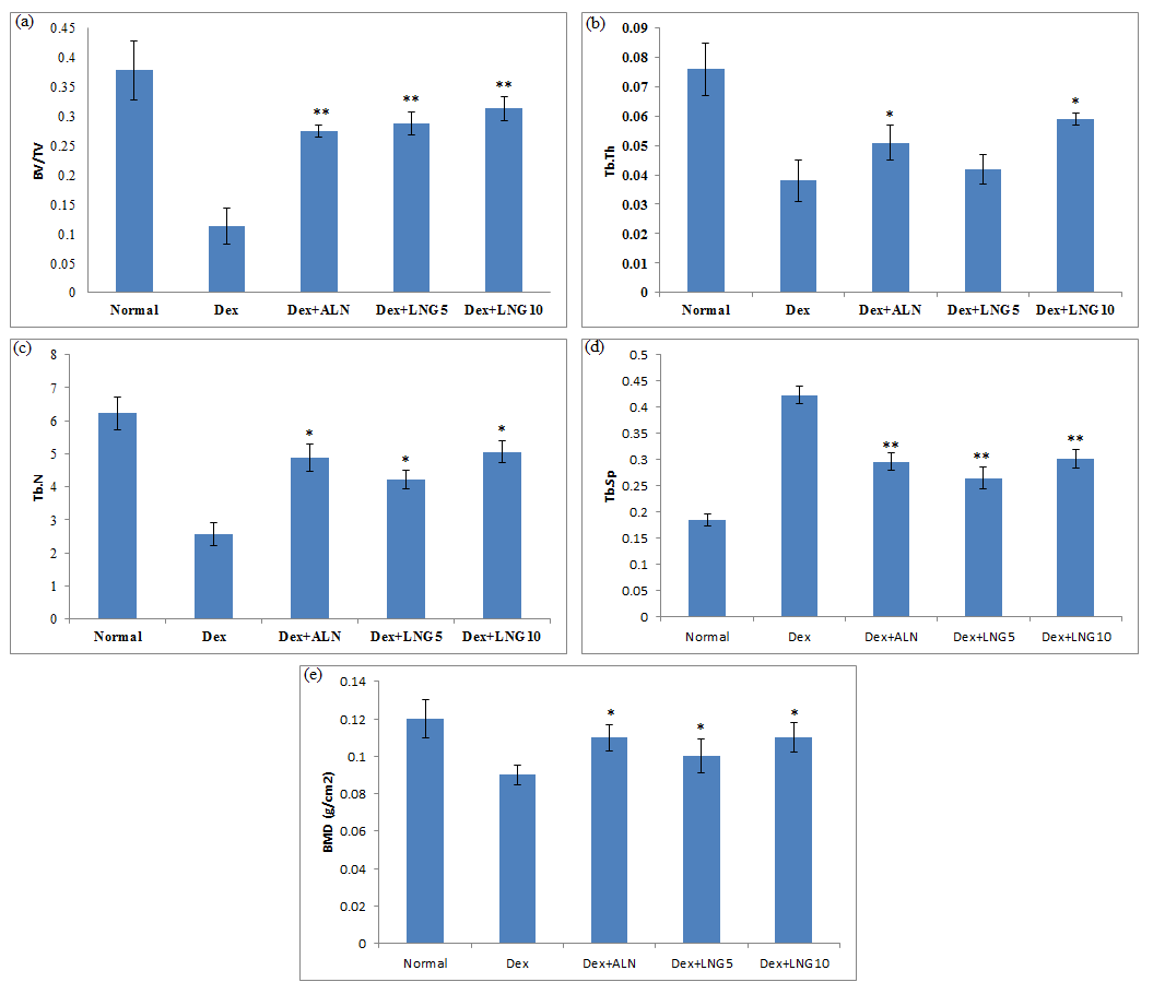 Micro-CT radiographs of the treatment groups (LNG5, LNG10 and ALN groups) showed an increase in trabecular integrity, reduction in lacunae and improvement in thickening of the trabecular wall. The trabecular bone parameters assessed also showed improvements in BV/TV, Tb. N, Tb. Th and Tb. Sp levels. BV/TV (p<0.01 for ALN, LNG5 and LNG10), Tb. N (p<0.05 for ALN and LNG10), and Tb. Th levels were significantly increased (p<0.05) while Tb. Sp was significantly reduced (p<0.01 for ALN, LNG5 and LNG10), in comparison with Dex (fig. 5). This effect was demonstrated dose-dependently as LNG10 group showed more improvements in the BV/TV, Tb. N, Tb. Th and Tb. Sp levels than the LNG5 group. BMD also showed significant improvement in the treatment groups (p<0.05 for ALN, LNG5 and LNG10) in comparison to Dex.