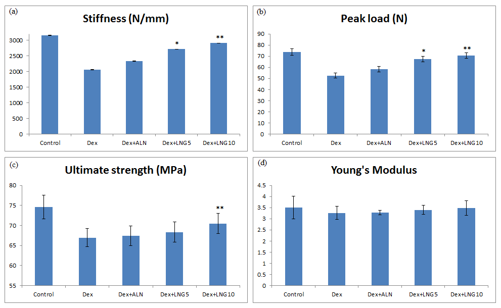 Results: Bone formation biomarkers (OC: osteocalcin, b-ALP: bone-specific alkaline phosphatase, PINP: N-terminal propeptides of type I procollagen) were significantly improved and resorption biomarkers (CTx: C-terminal cross-linking telopeptides of type-I collagen, TRAcP5b: isoform 5b of tartarate resistant acid phosphatase) were significantly reduced in the LNG5 (p<0.05) and LNG10 (p<0.05) treatment groups when compared to Dex. In vivo anti-osteoporotic results demonstrated the formation of new bone in osteoporotic rat tibias. Biomechanical strength testing demonstrated increased load-bearing capacity of rat tibias in the treated animals in comparison with the osteoporotic group (p<0.05 for LNG5 and p<0.01 for LNG10).