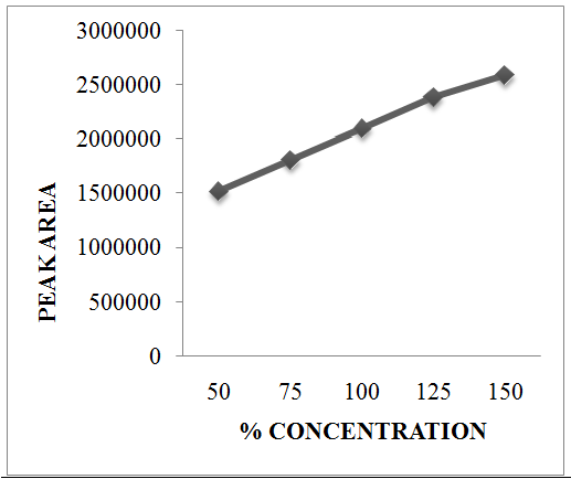 Standard solutions of Balofloxacin at different concentrations level (50%, 75%, 100%, 125%, and 150%) were prepared. Calibration curve was constructed by plotting the concentration level of drug versus corresponding peak area. The results show an excellent correlation between peak area and concentration level of drug within the concentration range (50-150µg/ml) for the drug and the results are given in Tables 4-5 and fig. 6. The correlation coefficient of Balofloxacin is greater than 0.995, which meet the method validation acceptance criteria and hence the method is said to be linear.