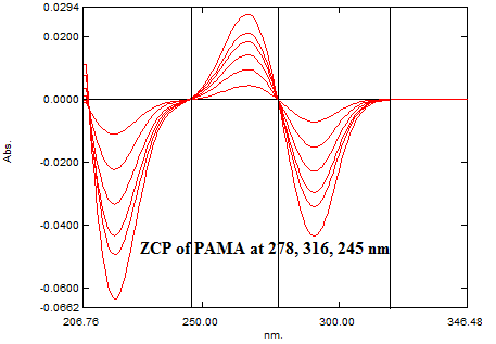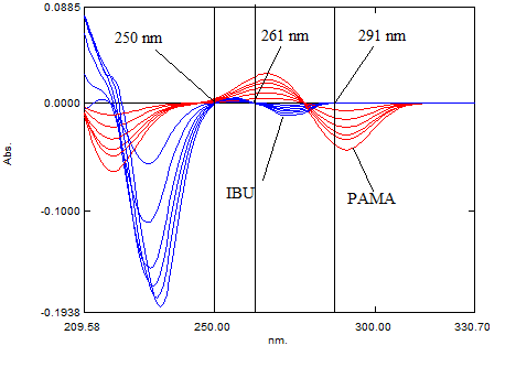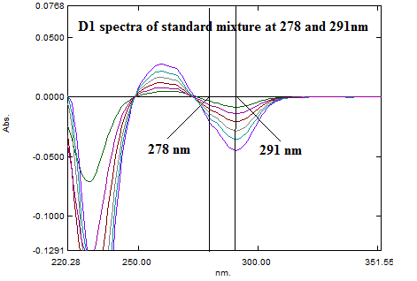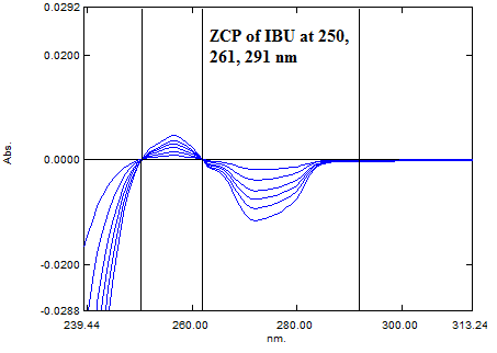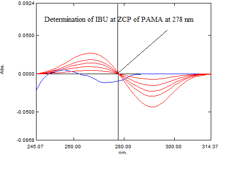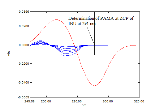 Three different ZCP at 278 nm, 316 nm and 245 nm was observed in overlain D1 spectra of PAMA (fig. 1). Three different ZCP at 250 nm, 261 nm and 291 nm were observed in overlain D1 spectra of IBU (fig. 2). For determination of analytical wavelength D1 spectra of PAMA and IBU were overlapped (fig. 3). While recording D1 absorbance of PAMA at ZCP of IBU, nonlinearity was observed at 250 and 261 nm while at 291, the linear response was observed with concentration (fig. 4). In similar way at ZCP of PAMA, linearity was observed only at 278 nm for IBU (fig. 5). So 291 nm and 278 nm was selected as analytical wavelength for quantitative determination of PAMA and IBU respectively.