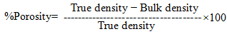 Porosity study was performed to check the extent of Nanochannels and Nano cavities formed [16]. The tapped and untapped (bulk) densities were determined by marking a small cuvette with known volume, then inserting a small known mass of powder into the cuvette (bulk density) and tapping it vertically against a padded benchtop 50 times (tapped density) [17]. The mass is divided by the initial and final volumes. True density was determined using ultra-pycnometer 1000. True density was calculated by dividing the sample weight by the sample volume [18]. Owing to their porous nature, Nano-sponge exhibit higher porosity compared to the parent polymer and co-polymers used to fabricate the system. Percent porosity is given by equation [19].