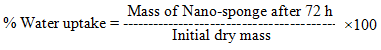 Swell able polymers Nano-sponge and water uptake was determined by soaking three different weighable mass of each prepared Nano-sponge formula in aqueous solvent for 72 h using graduated Eppendorf. Swelling and water uptake could be calculated using equations [19].