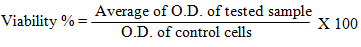 Numbers of cultured cells used in the experiment were 100,000 cell of each kidney (Vero) and liver (HepG2). MTT assay measures the cell metabolic activity, which is directly proportional to cell numbers [44]. The percentages of viable cells were determined in relation to the control cells fig. (9 A, B) and fig. (10 A, B). Cytotoxic effects of Nano-sponge loaded drug on Vero and HepG2 cells proliferation, viability and IC50 were carried out by MTT cytotoxicity assay as shown in tables 8 and 9. Different diluted concentrations of the tested Nano-sponge sample on cells viability were carried out starting from 1000 µg/ml to 19.531µg/ml. At high concentrations, toxicity was clear by cycling and shrinkage of both Vero and HepG2 cells. For epithelial kidney cells at 1000 µg/ml concentration viability% was low (6.957%) and toxicity% was high (93.042%). For epithelial liver cells viability % was (11.024%) and toxicity% was (88.975%). With dilution, the viability % increased while the toxicity% decreased hence at concentration 39.06 µg/ml the viability% of Vero cells was (99.169%), the toxicity% was (0.830%). At concentration 19.531 µg/ml the viability% of HepG2 cells was (99.392%), toxicity% was (0.607%). Decrease in cell growth measured by IC50 was 107.754µg/ml for Vero cells while IC50 for HepG2 cells was 147.736 µg/ml. Due to small size of Nano-sponge and high cellular uptakes the toxicity was great at high concentration and decreased with dilution. Toxicity test with all previous tests proved high efficient Nano-sponge loaded drug in addition to safety increased with decreased concentration. Also relation the numbers of tested cells to the numbers of whole boy cells (average 70 Kg body weight) the toxicity decline, so it concludes that nifedipine loaded Nano-sponge safe to administer orally at low concentration.