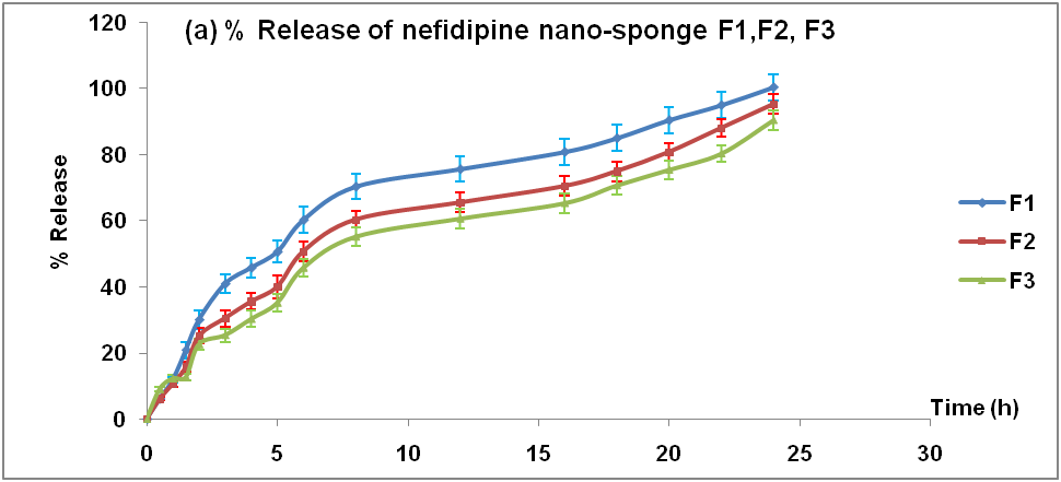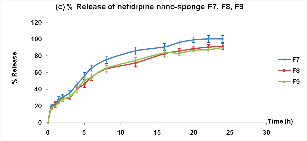 The prepared Nano-sponge formulations of nifedipine were tested for their drug content. Powder of each dried formula was taken and triturated properly. Then a quantity of powder equivalent to 20 mg of drug was mixed with 20 ml phosphate buffer pH 6.8 and shaken properly in incubator shaker (IKA KS 4000 i Germany), at (160 r/min) for 24 h at 37 °C. Then it was filtered through Whatman filter paper size 41, diluted to analyze for nifedipine content at λ max 235 nm using U. V Spectrophotometer (Shimadzu-UV/800, Japan).