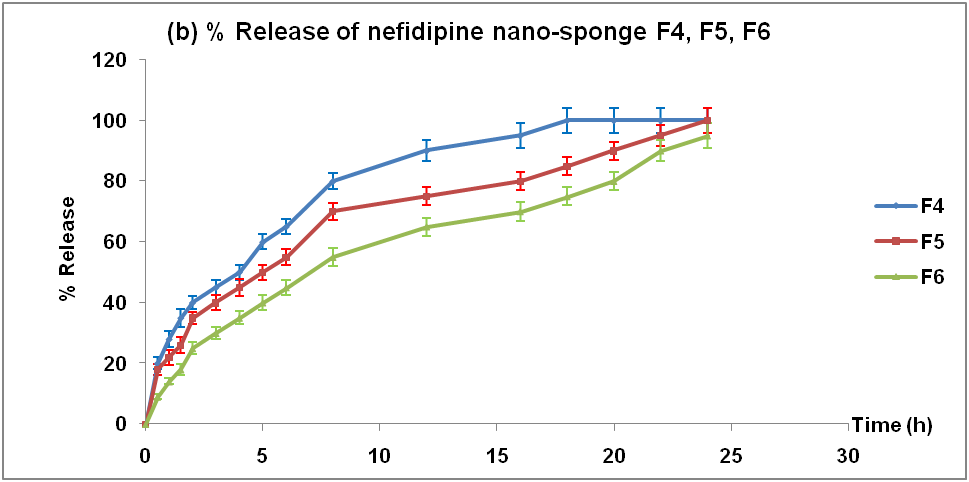 Results: Particle size in the range of 119.1 nm to 529 nm which were increased due to the increase in the concentration of polymer to the drug. Nano-sponge revealed porous, spherical nature. Increased in the drug/polymer molar ratios (1:1 to 1:3) may increase their % production yield ranged from 62.1% to 92.4%. The drug content of different formulations was in the range of 77.9% to 94.7%, and entrapment efficiency was in the range of 82.72 % to 96.63%. Drug released in controlled sustained pattern and followed Higuchi, s diffusion mechanism. Pharmacokinetic parameters of optimized formula showed significant higher maximum plasma drug concentration, area under plasma concentration-time curve, volume of distribution and mean residence time. Nano-sponge loaded drug proved biological safety at low concentrations.