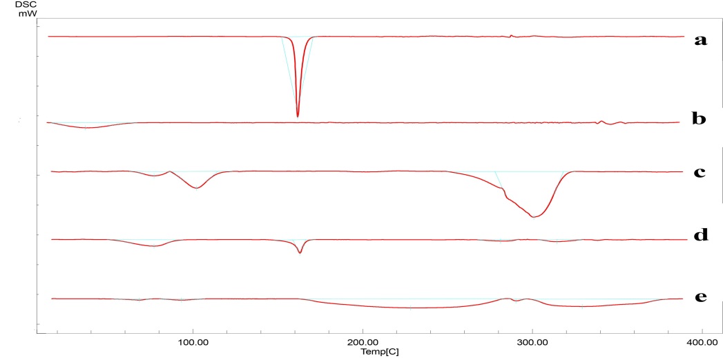 Thermal analysis was used in order to elucidate any interactions between drug, investigated polymer and Co-polymer. DSC was carried out using Shimadzu, DSC 60 thermal analyzer (Japan) with a liquid nitrogen cooling accessory. The analysis was performed under a purge of dry nitrogen gas (40 mL/ min−1). A sample of 2–5 mg was placed in an aluminum crucible cell and was firmly crimped with the lid to provide an adequate seal. The samples were heated from ambient temperature to 400 °Cat a preprogrammed heating rate of 10 °C/ min−1. All samples either individual, physical mixture or loaded Nano-sponge were analyzed in the same manner.