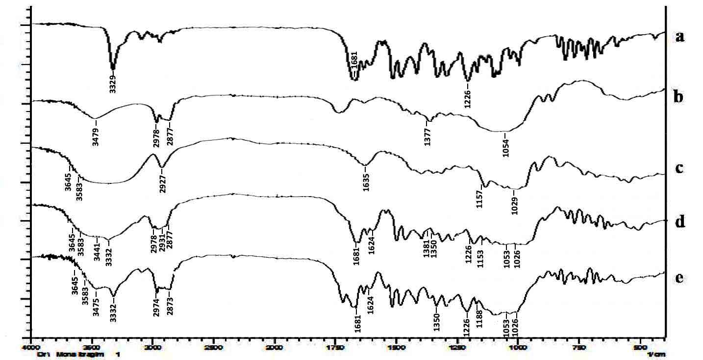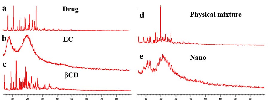 FTIR was used to study the molecular interaction between formulation components. The infrared spectrum of drug-loaded Nano-sponge sample was studied. FTIR spectra of ethylcellulose, β-cyclodextrin, pure drug, physical mixture and Nano-sponge were recorded by using an FT-IR spectrophotometer (Nexus 670, Nicolet, USA) in the region of 400–4000 cm-1 with spectra resolution of 4 cm-1.