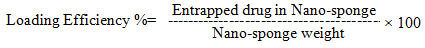 The specified weight of Nano-sponge suspension was analyzed by dissolving the dry sample in 10 ml of distilled water. After drug was dissolved 10 ml of clear layer was taken and amount of drug in the water phase was detected by a UV-spectrophotometric method at λ max 235 nm. The test was repeated with another Nanoparticulate sample. The amount of drug encapsulated in Nano-sponge was analyzed by cooling centrifugation (Sigma, 3-30KS, Germany)for 30 min at 15000 r/min and 4 °C and by measuring the concentration of drug in the clear supernatant layer by the UV-spectrophotometric method at λ max 235 nm. The test was again repeated with another sample. Drug concentration was determined with the help of calibration curve plotted in three different media (deionized water, 0.1N HCl pH 1.2 and phosphate buffer pH 6.8). The amount of drug inside the particles was calculated by subtracting the amount of drug in the aqueous phase of the colloidal dispersion from the total amount of the drug in the Nano dispersed particles. The entrapment efficiency (%) of drug was calculated by the following equation.