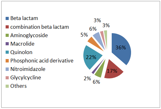 Fig. 1: It shows the frequency of Antibiotic class used in ICU during July-December 2014.