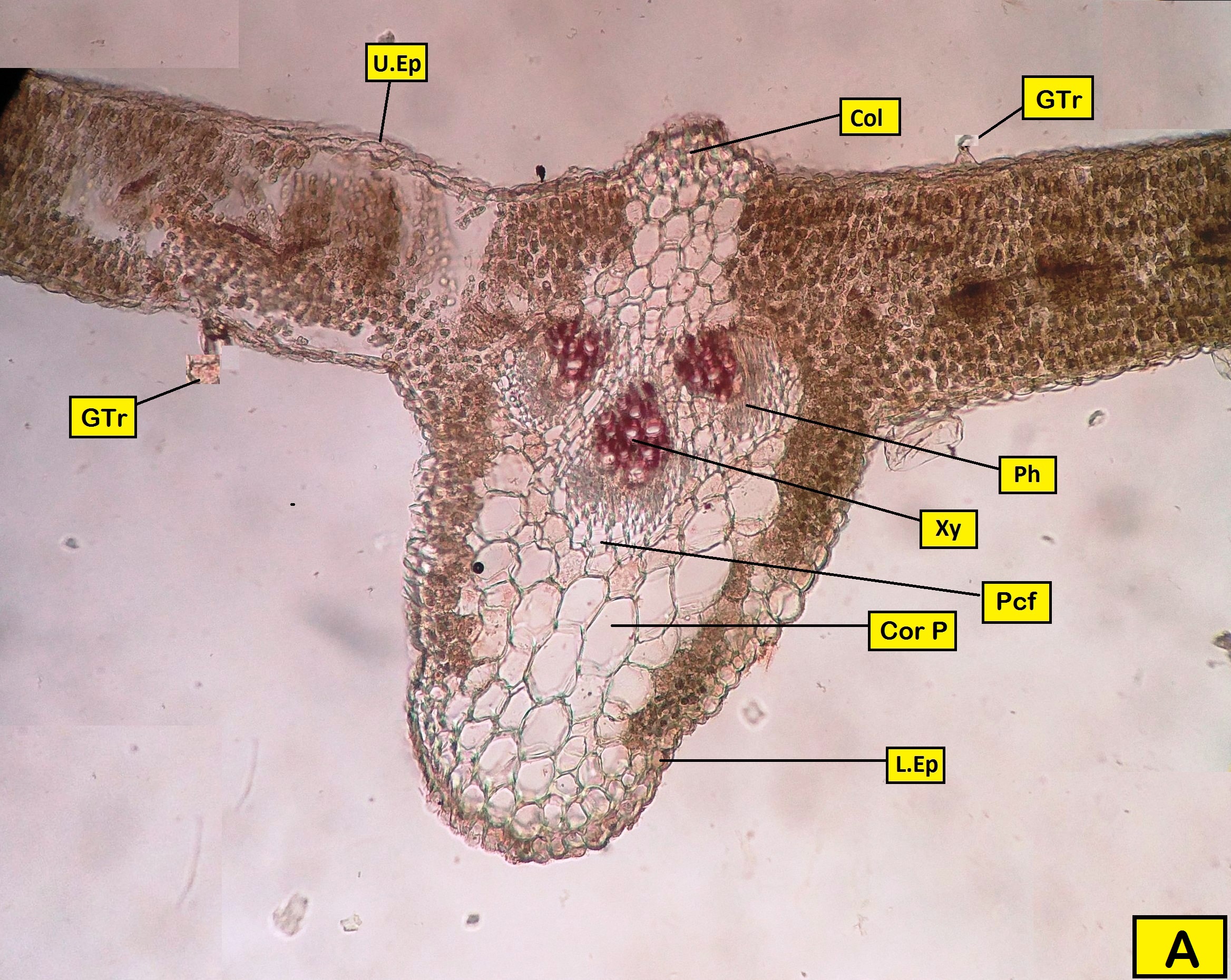 Transverse section of the Physalis minima leaf has represented in fig. 2A. Midrib of leaf composed of upper (U. Ep) and lower (L. Ep) epidermis, followed by 3-4 layers of collenchymatous cells (Col) present below the upper epidermis. Cortical parenchyma present throughout the midrib region, which surrounds the vascular bundle area and spread up to above lower epidermis. Vascular bundles were seen where xylem vessels (Xy) covered by phloem cells (Ph). Xylems were clearly stained violet in phloroglucinol and HCl. Pericyclic fibers (Pcf) were seen outside of vascular bundle covering the xylem and phloem.