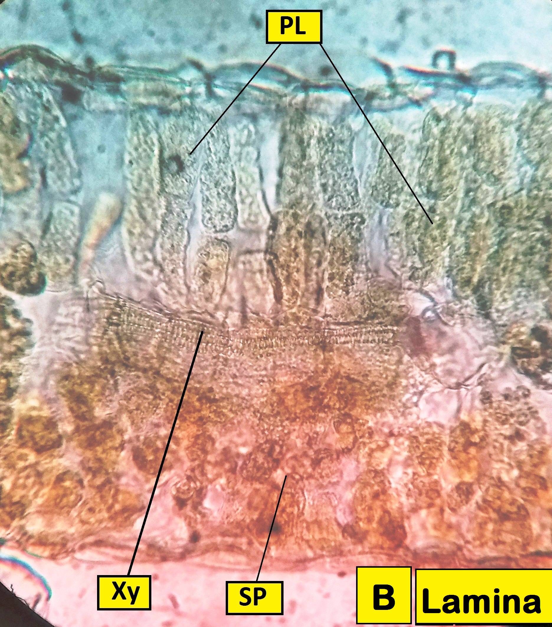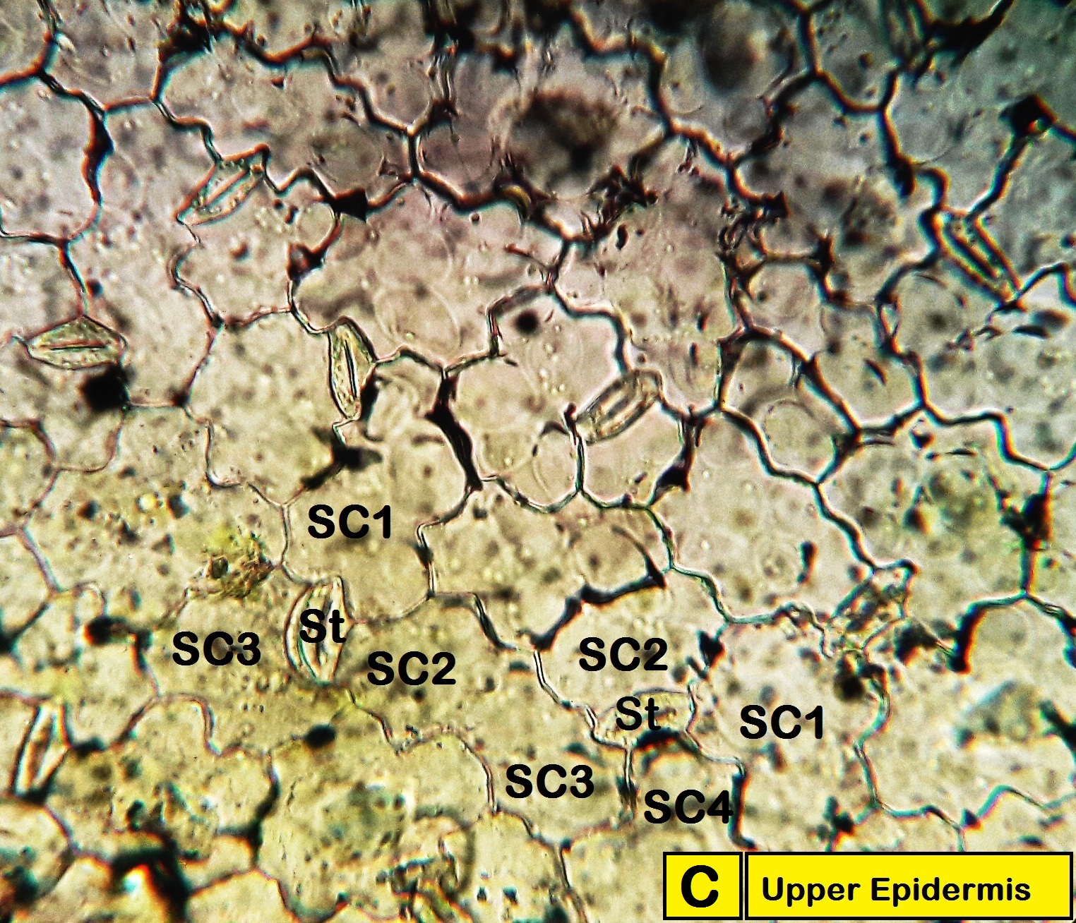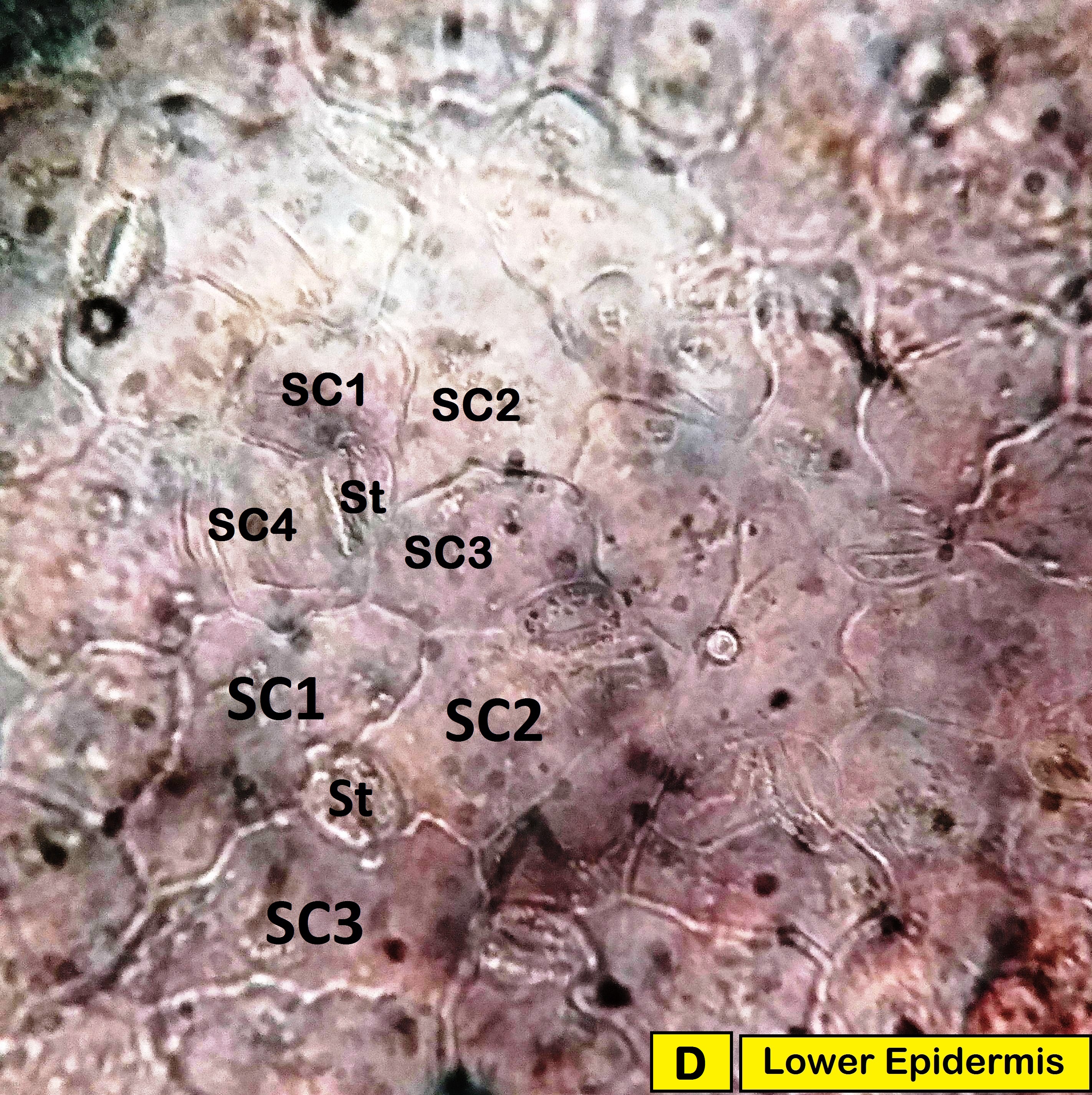 Lamina (fig. 2B) characterized by the dorsiventral arrangement of cells composed of upper epidermis, mesophyll, and lower epidermis. Upper epidermis is single layer rectangular parenchymatous cells contain multicellular glandular trichomes (GTr), anomocytic stomata (St) (fig. 2C) surrounded by varying number of subsidiary cell (SC1, SC2, SC3 or somewhere SC4). Mesophyll composed of palisade parenchyma (PL) just below upper epidermis and spongy parenchymatous cells (SP) above lower epidermis (PL and SP are arranged dorsoventrally) and in the junction of these two (PL and SP) spiral-shaped xylem (Xy) vessels were seen. Palisade parenchyma is compact, radially elongated cell and occupies the 3/5 of lamina. The similar lower epidermis also consists of single-layer rectangular parenchymatous cells contain multicellular glandular trichomes (GTr), anomocytic stomata (St) (fig. 2D) surrounded by varying number of subsidiary cell (SC1, SC2, SC3 or somewhere SC4). The above cells have observed with different magnification (10× and 40×) under the compound microscope.