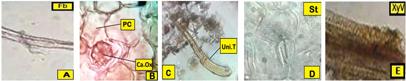 Fig. 3: Powder study of the leaf of Physalis minima [10× and 40× magnification], [Abbreviations-Fb: Fibre (A); Ca. Ox: Calcium oxalate crystal (B); PC: Parenchymatous cell (B), Uni. T: Uniseriate Trichome (C); St: Stomata (D); XyV: Xylem Vessels (E)]