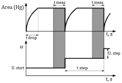 The SMDE used successfully in polarographic analysis. The SMDE combines the features of the DME and HMDE: As with the DME, the drops are constantly renewed, but during the measurement the drop area is constant as in the HMDE case. In a subsequent voltage (U) sweep, the Hg drops are knocked off by the tapping mechanism after the time t step set in the measurement mode. The nature of the measurement is shown in fig. (1) using the SMDE as an example. The SMDE is primarily used for sensitive measurements in which the surface of the mercury drop must be renewed for every measurement.