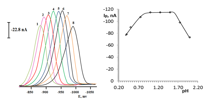 It is well known that the type of supporting electrolyte and pH of the media is very important for electrochemical studies. The values of pH solution (from 0.4 to 2.0) affect the peak current significantly. The influence of pH from 0.40 to 2.00 on Ip and Ep was studied. The values of Ip increase with increasing pH value of 0.40 to 1.00 then become semi-fixed until pH 1.6 after that decrease to pH=2.00, see fig. (2). Ep values are growing a negative value from -878 mV (when pH = 0.40) to -990 mV (when pH = 2.00).