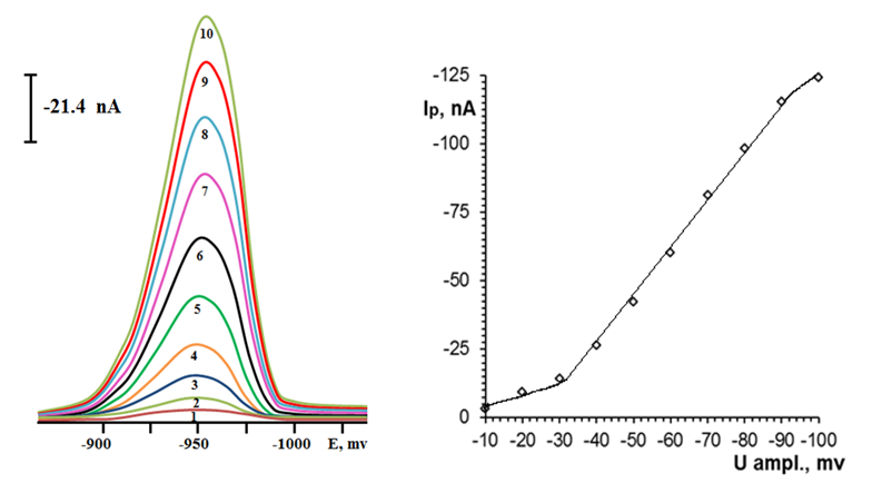 Fig. 3: The effect of negative pulse amplitude (U ampl.) on the polarograms of RSV (192.56 ng. mL-1) using DPPA at SMDE at: 1) - 10; 2) -20; 3) -30; 4) -40; 5) -50; 6) -60; 7) -70; 8) -80; 9) -90 and 10) -100 mV (Purge gas N2, Purge time 100 s, Scan rate 5.0 mV/s, pH=1.5, t. meas. 32 ms, t. pulse 40 ms, t. step 1.6 s, temperature of solution 25°± 5°C and Na2HPO4 buffer)