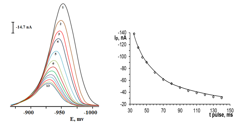 The effect of time pulse (35, 40, 45, 50, 60, 70, 80, 90, 100, 110, 120, 130 and 140 ms) on polarograms was as the follows: Ip decreases with increasing time pulse and Ep has become increasingly latency positive value (-952 to -929 mV) with increasing t. pulse. The peak was more symmetrical when the t. pulse value of 40 ms, see fig. (4).
